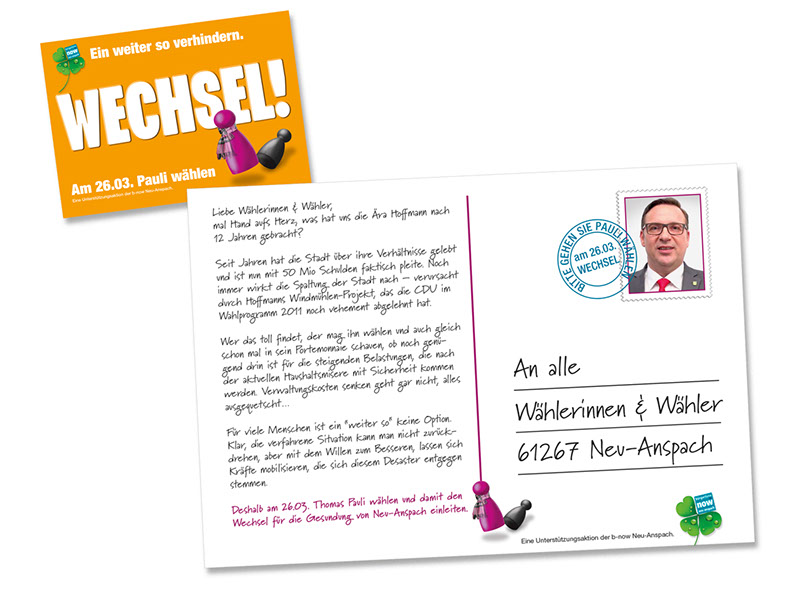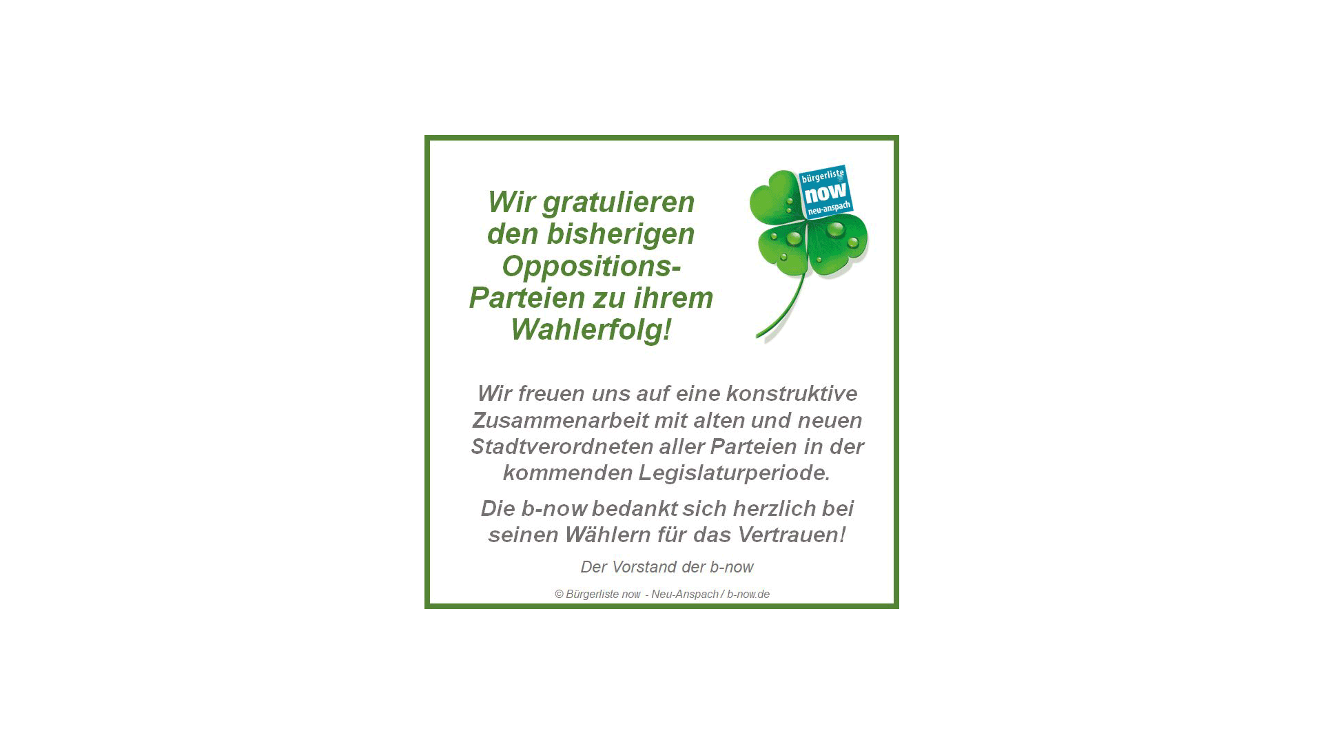 Im März 2017 wählt Neu-Anspach einen neuen Bürgermeister. Nachdem die erst im September 2015 gegründete Bürgerliste b-now in den vergangenen Monaten nachhaltig auf das politische Geschehen in Neu-Anspach Einfluss nehmen konnte - 27%-Erfolg bei der Kommunalwahl, Akteneinsichtsausschuss zum Windkraftvertrag, erfolgreicher Bürgerentscheid - galt es nun realistisch die Chancen für einen eigenen Kandidaten abzuwägen. Erwartete über 50 Millionen Euro Schulden bis Ende 2017 sind die größte Herausforderung vor der Neu-Anspach je stand. In schweren Zeiten geht es für den zukünftigen Bürgermeister nicht nur um persönliche Integrität und Kommunikationsfähigkeit, sondern um Sachkenntnis und Erfahrung in der kommunalen Haushaltsführung. Als neue politische Kraft kann die b-now den unbedingt notwendigen kommunalpolitischen Hintergrund noch nicht vollumfänglich in die Waagschale werfen. Es wäre daher vermessen, einen eigenen Kandidaten für das Amt des Bürgermeisters ins Rennen zu schicken, zumal dessen Stand sehr schwer wäre.