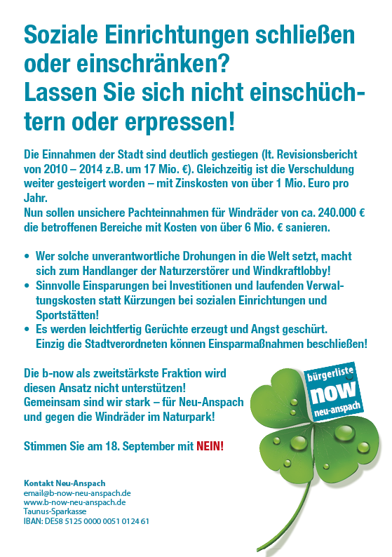 Die b-now hat sich der Verantwortung für die Haushaltsdebate und deren inhaltlicher Ausgestaltung gestellt. Gemeinsam mit SPD und den Linken wurde u.a. auch die notwendige Erhöhung der Gewerbesteuer auf 380% - wie im HFA beschlossen – vorgelegt. Es ist jedem klar, dass solche Entscheidungen weder angenehm noch einfach sind. Aber die Zeit der leichten Entscheidungen ist vorbei. Im Gegensatz zu CDU, Grüne und FWG/UBN waren die b-now, SPD und Linke bereit diese eigenen Entscheidungen für Neu-Anspach zu verantworten. Das Vorlegen eines nicht genehmigungsfähigen Haushalts verbunden mit der Hoffnung, dass die Konsequenz vielleicht nicht so schlimm wird, widerspricht allen Standards für die die b-now steht. Hier wird weder die eigene Verantwortung ernst genommen, noch wird den Bürgern reiner Wein eingeschenkt. Bereits die Vertreter des hessischen Innenministeriums waren sehr deutlich in ihrer Präsentation und Deutung der Zahlen von Neu-Anspach und ließen keinen Zweifel daran, dass es aus deren Sicht genügend Spielraum für Erhöhungen der Kindergartengebühren, der Gewerbesteuer und der Grundsteuer B gibt. Die b-now sieht in der jetzigen Situation das Solidaritätsprinzip als einzig gerechte Lösung an. Sowohl Unternehmen als auch die Bürger werden um eine Erhöhung der Steuern und Gebühren nicht herumkommen. Die Frage ist, ob die Parlamentarier genügend Rückgrat haben, um harte und notwendige Entscheidungen selbst zu treffen oder ob man lieber nach Wiesbaden zeigt und anderen die Beschlüsse überlässt.