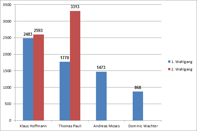 Dank dem Umstand, dass sich die Linke enthielt und nicht alle CDU- und SPD-Parlamentarier der Absprache ihrer Parteiführung zustimmten, musste die Position des ersten Stadtrats ausgelost werden. Das Los fiel auf die b-now, so dass der Posten des 1. Stadtrats von Prof. Dr. Gerriet Müller übernommen wird. Er ist damit 1. Stellvertreter des Bürgermeisters.