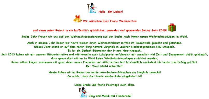 Mecki und Jörg, mit Kibo und Shira. Vielen Dank für Euer Foto und den lieben Weihnachtsgrüßen.