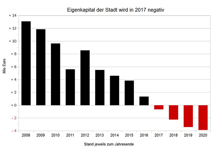 Bekanntlich haben der Stadt diverse unverschuldete Belastungen zum Haushalt 2020 einen Fehlbetrag von weit über 2 Mio Euro erzeugt, der bei der historischen Altlast nicht zu kompensieren war. Allen, die Anderes behaupten sei gesagt, die Schuldenwende ist dennoch geschafft, denn seit 2016 sind die Schulden nicht mehr, wie in den Jahren seit 2008, um jährlich ca. 4 Mio Euro gestiegen, sondern leicht gesunken. Die galoppierende Zunahme der Verschuldung ist gestoppt und die Stadt hat wieder ein wenig Eigenkapital in den Büchern.