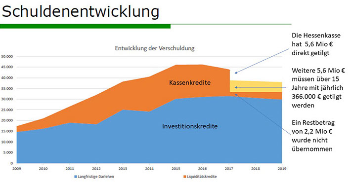 Zur Erinnerung: Mehrfach hatte der Landrat als Kontrollinstanz die ehemalige Stadtregierung vor 2016 ermahnt, die Finanzen zu konsolidieren. Zur Zeit des Doppelhaushaltes 2015/2016 wollte der alte Bürgermeister einen Genehmigungsrahmen für Kassenkredite von über 20 Mio. Euro beantragen, um die Löcher zu stopfen – das Eigenkapital war aufgebraucht und somit die Kreditwürdigkeit der Stadt ausgereizt. Es muss für die CDU geradezu eine Erlösung gewesen sein, aus dieser Verantwortung durch die verlorene Wahl befreit worden zu sein, denn die Altlasten sind nicht wegzudiskutieren. Nach 2016 wären, unabhängig von der Farbe der Parteien im Stadtparlament, in jeder Beziehung äußerst schmerzliche Einschnitte notwendig geworden. Auch dem Landrat wäre es nicht mehr möglich gewesen, seinen Entscheidungsspielraum zu Gunsten der Stadt Neu-Anspach weiter auszuschöpfen, weil die gesetzliche Schuldenbremse dies nicht mehr erlaubt hat. Unzweifelhaft hat es harte Rückschläge für die Bemühungen um Konsolidierung gegeben und es ist auch klar, dass noch ein weiter Weg zu gehen ist.
